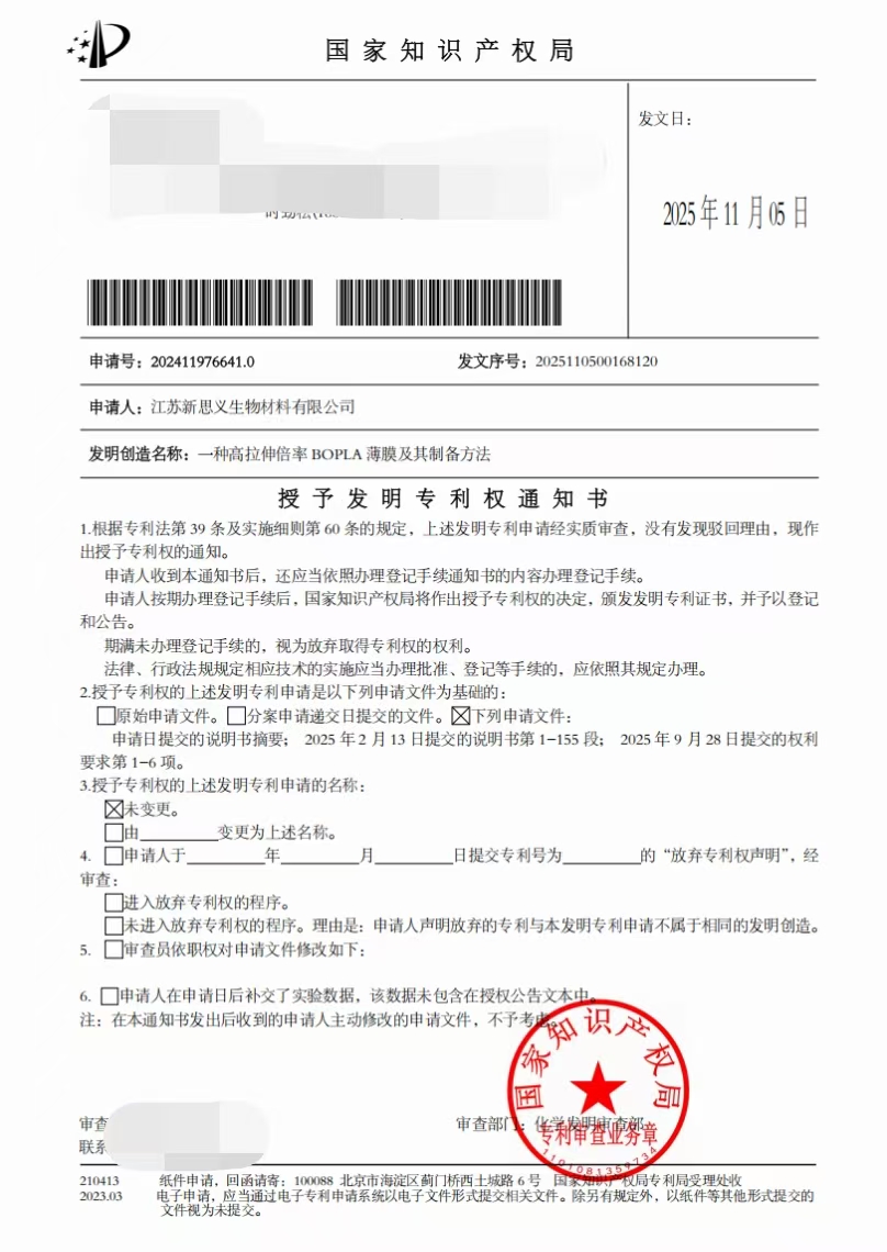 近日,我司在生物基可降解材料领域再获重要进展。公司于2025年11月5日正式收到国家知识产权局下发的《授予发明专利权通知书》,发明创造名称为“一种高拉伸倍率BOPLA薄膜及其制备方法”(专利号:202411976641.0)。这一专利的获批,标志着新思义在功能性双向拉伸聚乳酸薄膜(BOPLA)的研发与产业化应用方面迈出了坚实的一步。